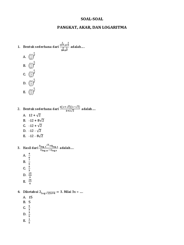Soal Soal Pangkat Bentuk Akar Dan Logaritma