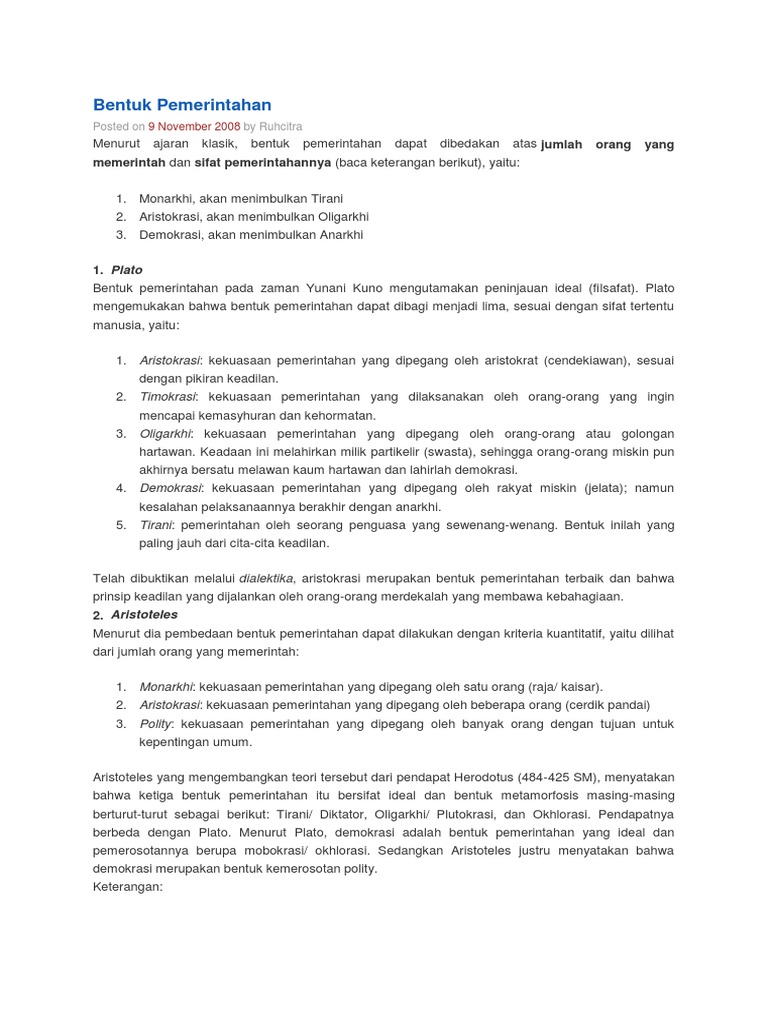 Bentuk Pemerintahan Klasik A Ajaran Plato Ada 5 Bentuk Pemerintahan 1