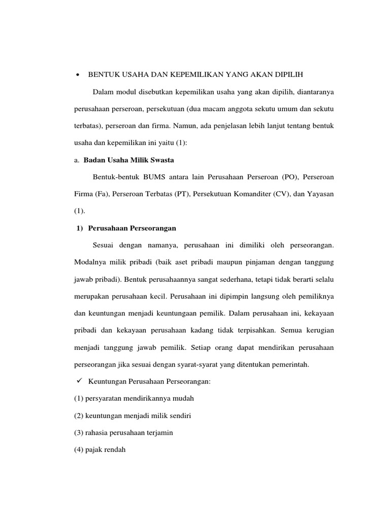 Bentuk Usaha Dan Kepemilikan Yang Akan Dipilih