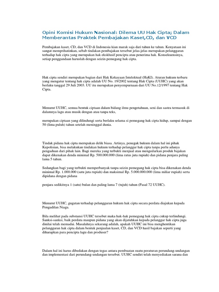 Opini Komisi Hukum Nasional Dilema Uu Hak Cipta Dalam