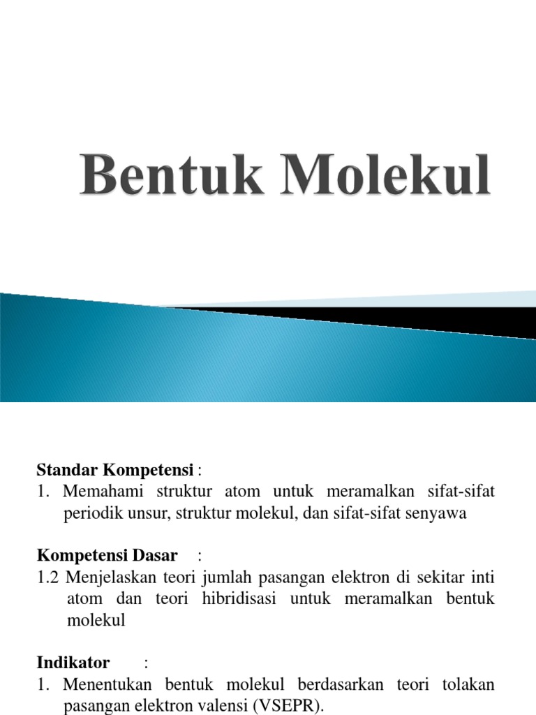 cara menentukan bentuk molekul dengan teori hibridisasi Bentuk ialah satu titik temu antara ruang dan massa.Bentuk juga merupakan penjabaran geometris dari bagian semesta bidang yang di tempati oleh objek tersebut, yaitu ditentukan oleh batas-batas terluarnya namun tidak tergantung pada lokasi (koordinat) dan orientasi (rotasi)-nya terhadap bidang semesta yang di tempati.