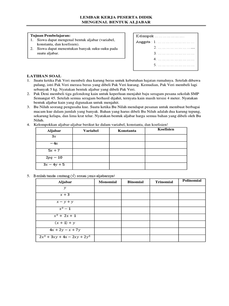 A Operasi Bentuk Aljabar 1 Pengertian Suku Koefisien Bentuk 8x